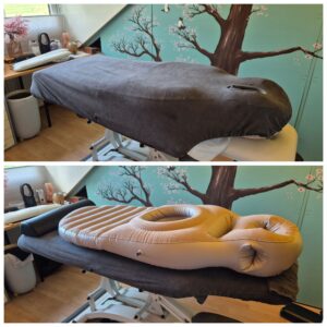 Belangrijk om te weten is dat er nooit een massage geven wordt in de eerste drie maanden van de zwangerschap. Met mijn nieuwe kussen kan er nu gemasseerd worden tot de laatste weken van de zwangerschap